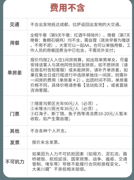 (3)如果因为个人原因未保管好个人财物造成遗失,队员需要留下来自行处理的,队员需要签定《脱团协议》,“大美川藏”将退回队员未产生的门票和住宿费80元/人/天,已经产生的住宿、门票、和全程的车费、保险费等将不予退还。