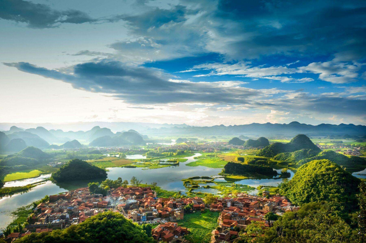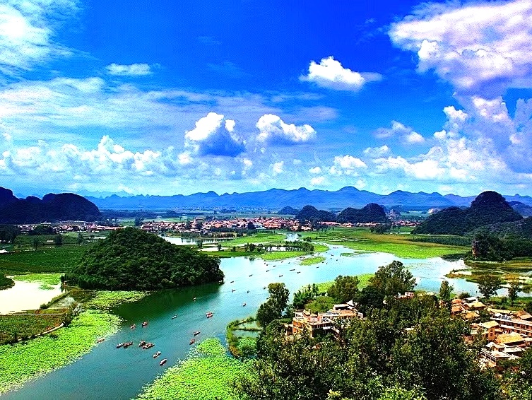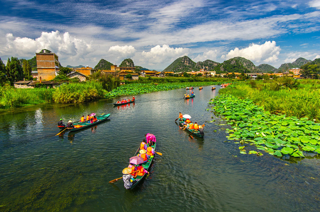 随后将会在拥有水上田园、湖泊峰林、荷花世界、彝家水乡组合而成的喀斯特地貌当中穿行。只需到达固定停车点等待上车前往下一站观光即可。总之,您可以灵活安排您其它的宝贵时间,在这美景当中慢慢享受闲暇的时光。
