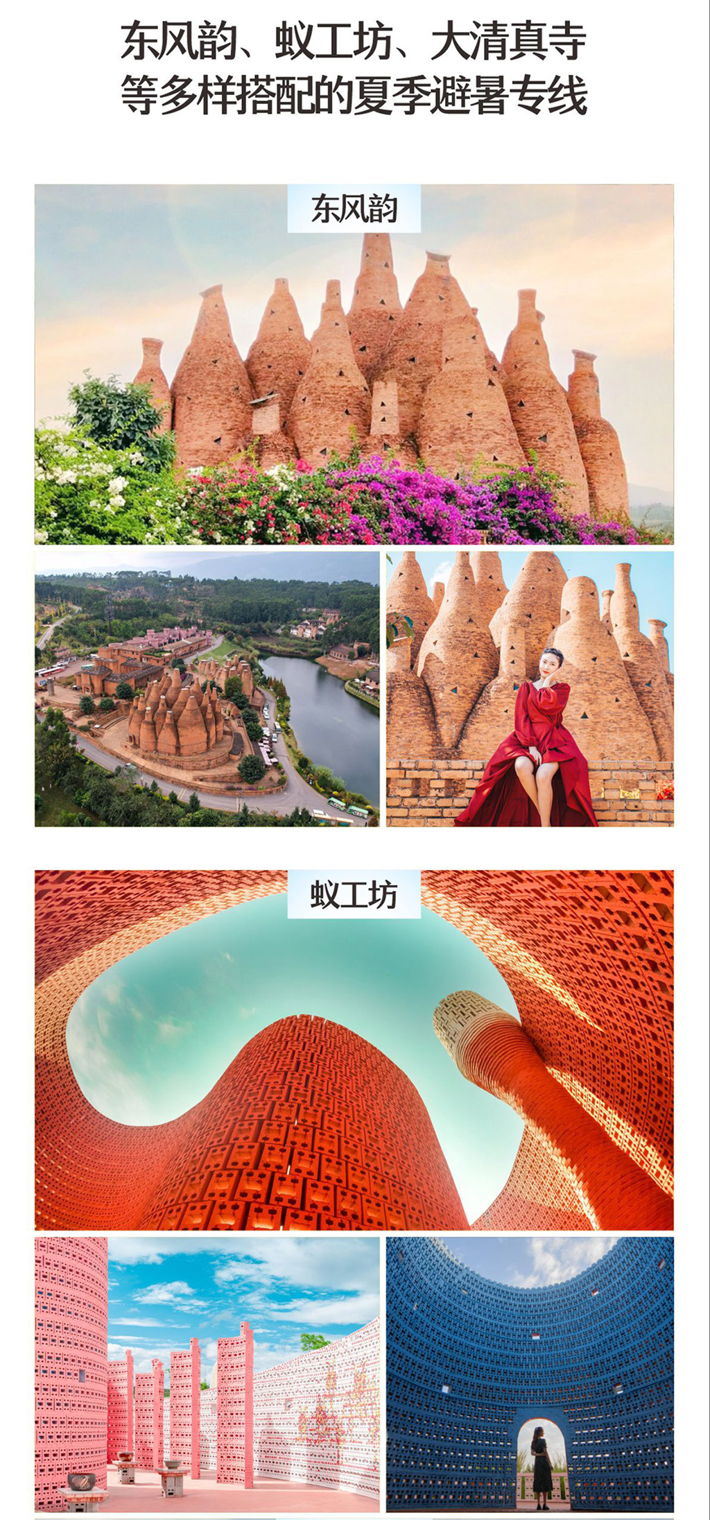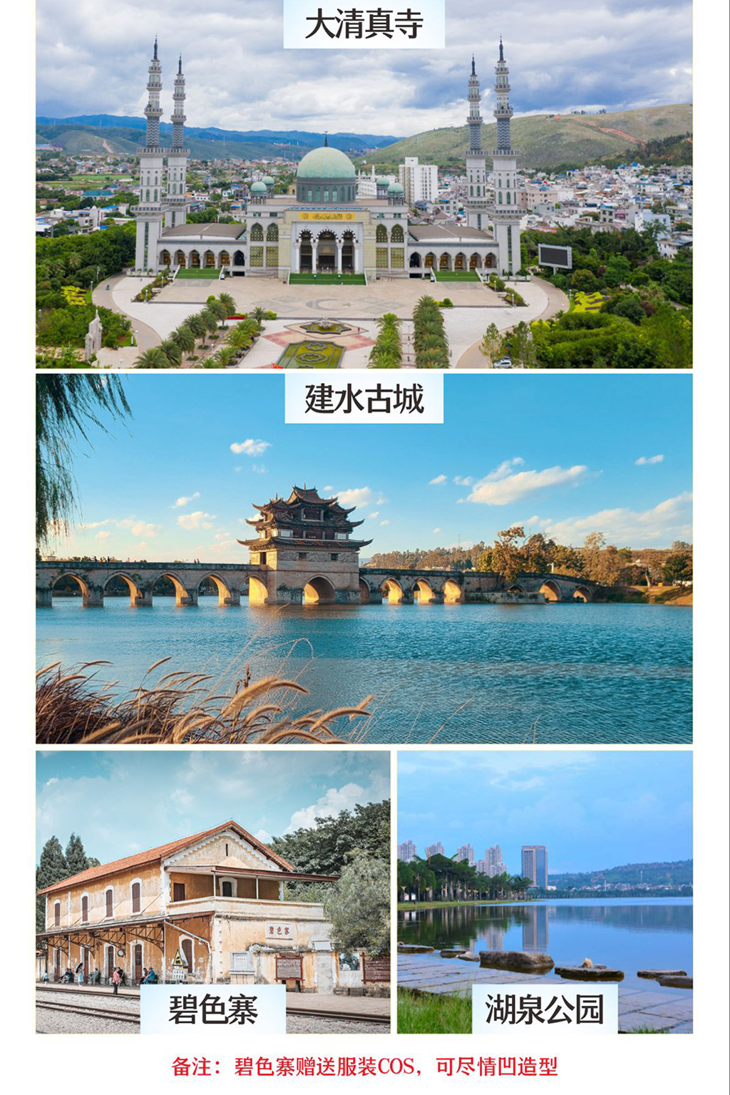 【深度体验】:1)摒弃走马观花,每个景点都预留了充足的时间,更加轻松和人性化;2)在抚仙湖专门安排一段环湖,寻一处人少景美的地方尽情玩耍;3)住“进”坝美景区里面,更深度的融入景点;4)碧色寨赠送服装COS,可尽情凹造型。