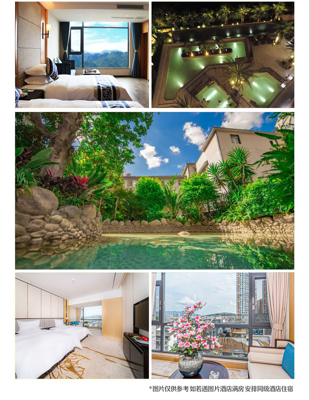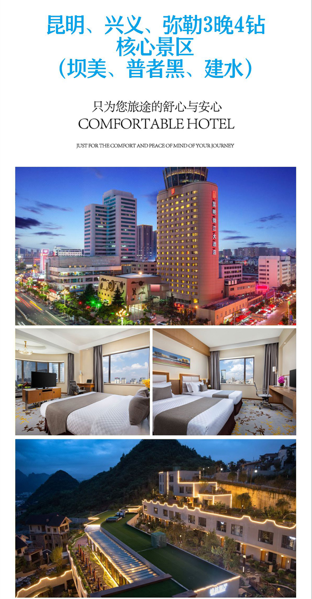 昆明市四钻酒店一晚、万峰林景区度假酒店或兴义市四钻酒店一晚、坝美景区民宿客栈一晚、普者黑景区特色客栈或酒店一晚、弥勒四钻酒店一晚、建水古城精选酒店一晚;