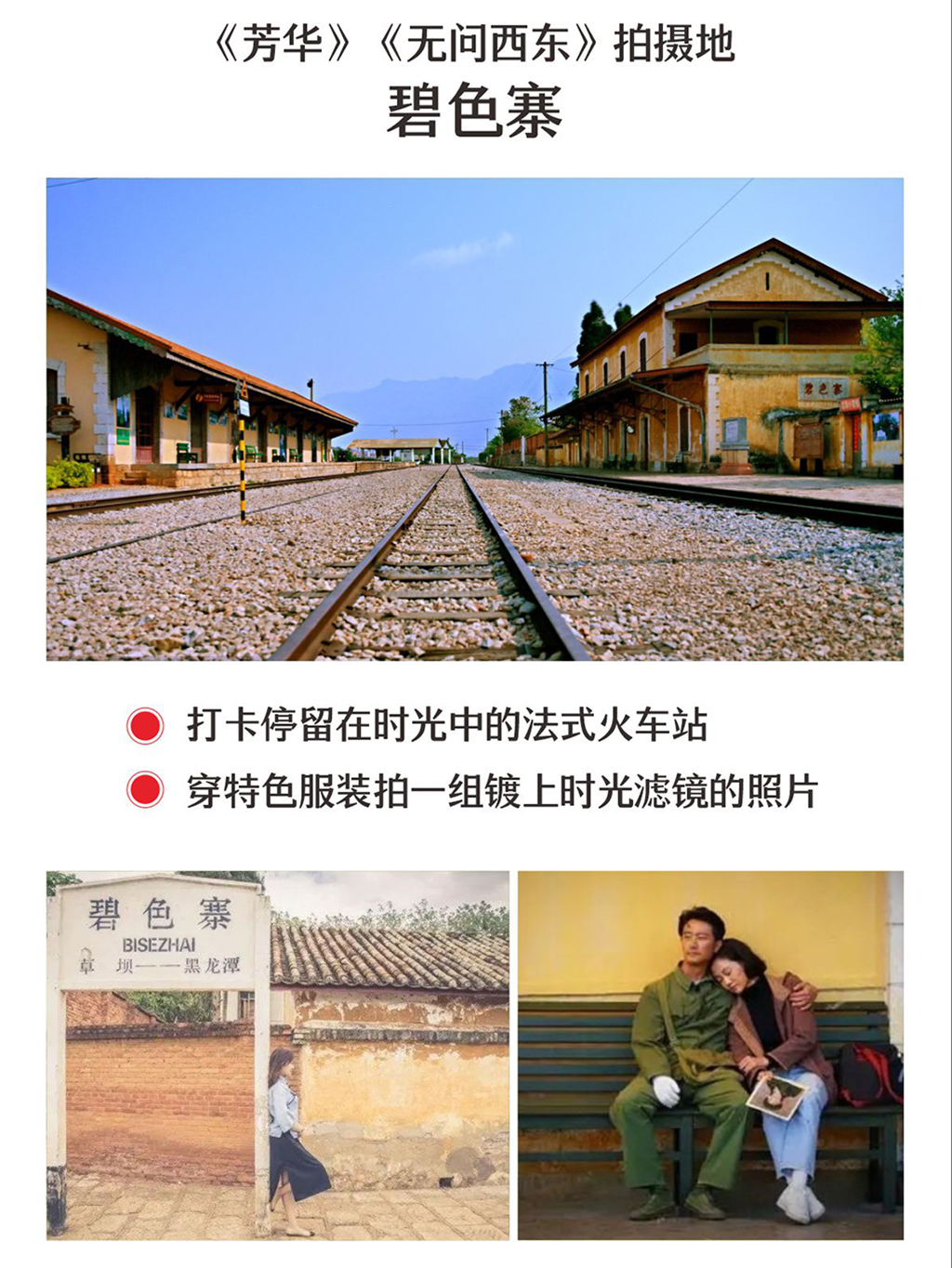 早餐后,约2小时抵达蒙自百年历史记忆库,素有 “小巴黎”之称的【滇越铁路-碧色寨】。这里是电影《芳华》和《无问西东》的拍摄地,斑驳的法式建筑和古旧的铁轨,镌刻着它曾经不可磨灭的光辉岁月,现在是摄影师和画家最喜欢去的取景地点。在这里我们特地为大家准备了军装,大家可以尽情在这里凹造型。