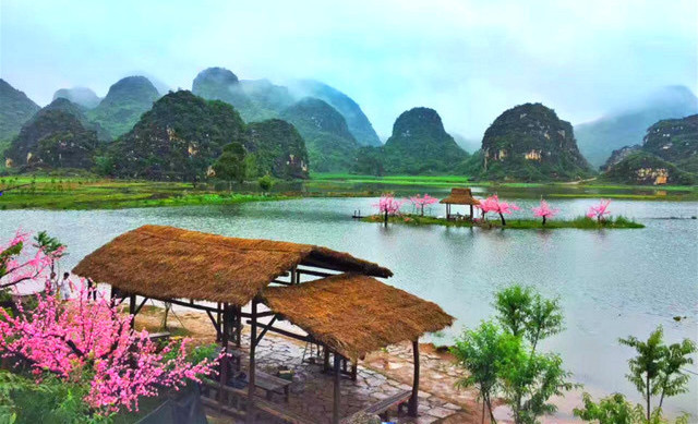 适时前往【坝美世外桃源】,先乘景区观光车到达洞口,再乘小船穿过约1公里的水洞,映入眼帘的是别有洞天的幽静秀美壮族村庄,四周群山环抱,八座山峰一字排开如一副水墨画卷!当这样与世隔绝的壮族村寨出现在眼前时,你一定会猛然想到陶渊明笔下的世外桃源,因为一切情境与《桃花源记》竟是如此的相像。