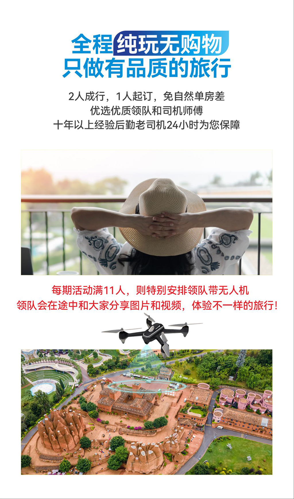 【出行无忧】:1)2人成行,1人起订,免自然单房差;2)优选优质领队和司机师傅,十年以上经验后勤老司机25小时为您保障;3)全程纯玩无购物,只做有品质的旅行;
