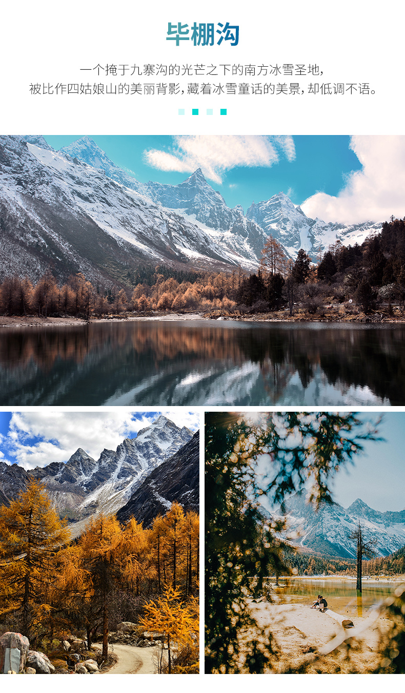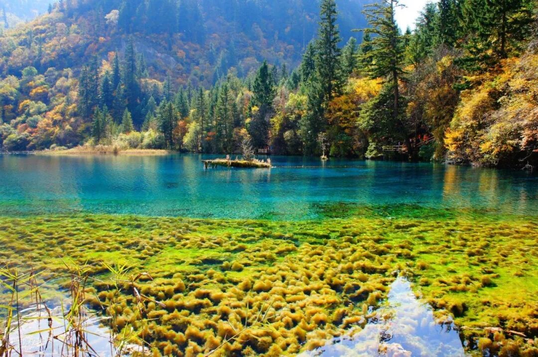 【九寨沟】得名于沟内有九个藏族村寨,以“九寨六绝”——翠湖、叠瀑、彩林、雪峰、藏情、蓝冰而闻名天下。远望林海翻涌起绿浪,一座座清秀俊丽的青山覆满绿林,风一过便簌簌作响翻做一片绿的汪洋;近看碧水澄澈,清可见底,九寨沟的海子沉淀着不同矿物质,因此个个色有不同,或澄青或碧绿或鹅黄,宛若上天散落人间的宝石;除却如梦似幻的自然景观,还有藏家木楼、晾架经幡、栈桥、磨房、藏族习俗及神话传说构成的人文景观,也因这不二的美,你能在这里见到许多热门影视剧里的取景场地。