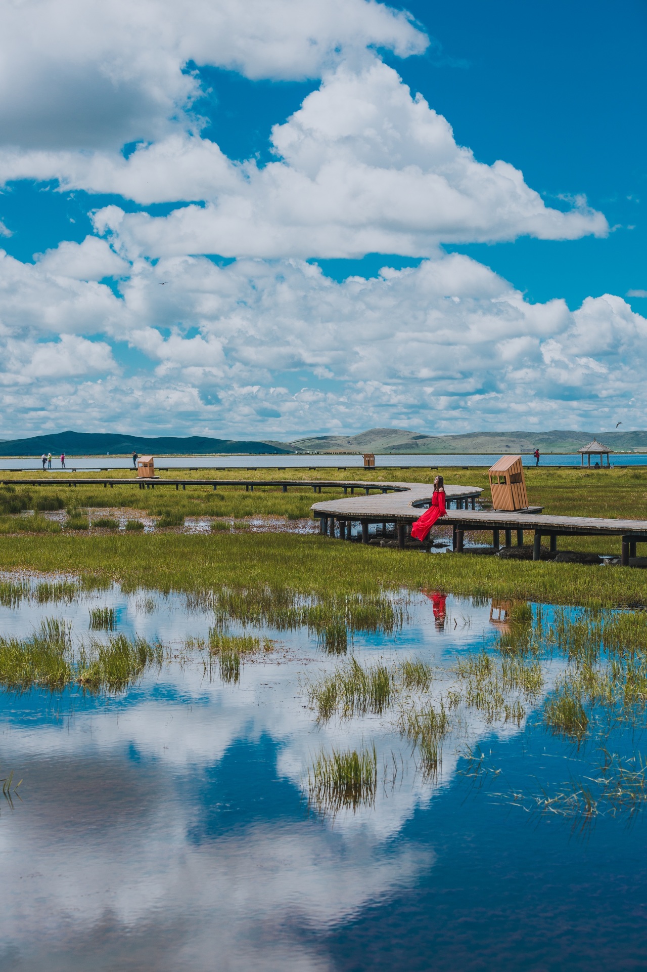 然后我们前往草原湖泊【若尔盖花湖】,花湖湖面辽阔,水下是深不可测的沼泽地,在阳光的照耀下,水面反射出不同的光彩,摄人心魄。湖边是大片茂密的芦苇丛,随微风拂动,越发映衬出湖面的宁静与沧桑。花湖最漂亮的时候是每年夏天,草地上开满了五颜六色的花朵,极为漂亮。广阔的草原一片碧绿,蓝色的花湖被一片绿色包围,仿佛绿色地毯上的一颗蓝宝石,美轮美奂。湖边建有木质栈道,一直延伸到水中,可以沿着栈道走到湿地深处,沿途都可以找到拍大片的好角度。花湖是众多野生飞禽的主要栖息地,湖面上游弋着黄鸭、斑头雁、天鹅、黑颈鹤等珍稀动物,还有高原鱼类和其他珍稀动物。坐在湖边或者栈道上的亭子里,常有黑颈鹤从湖面上掠过。