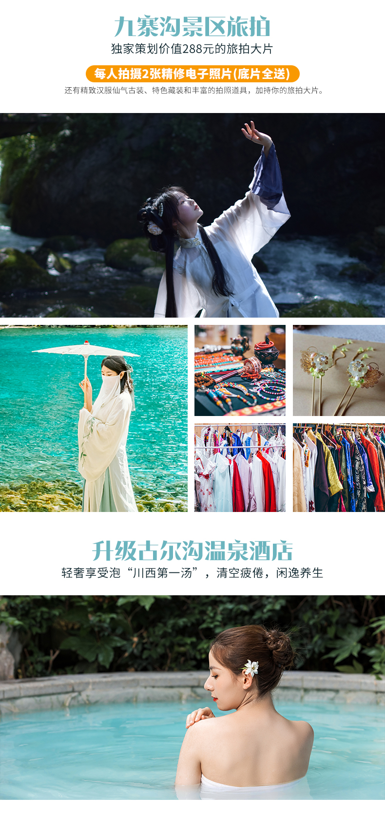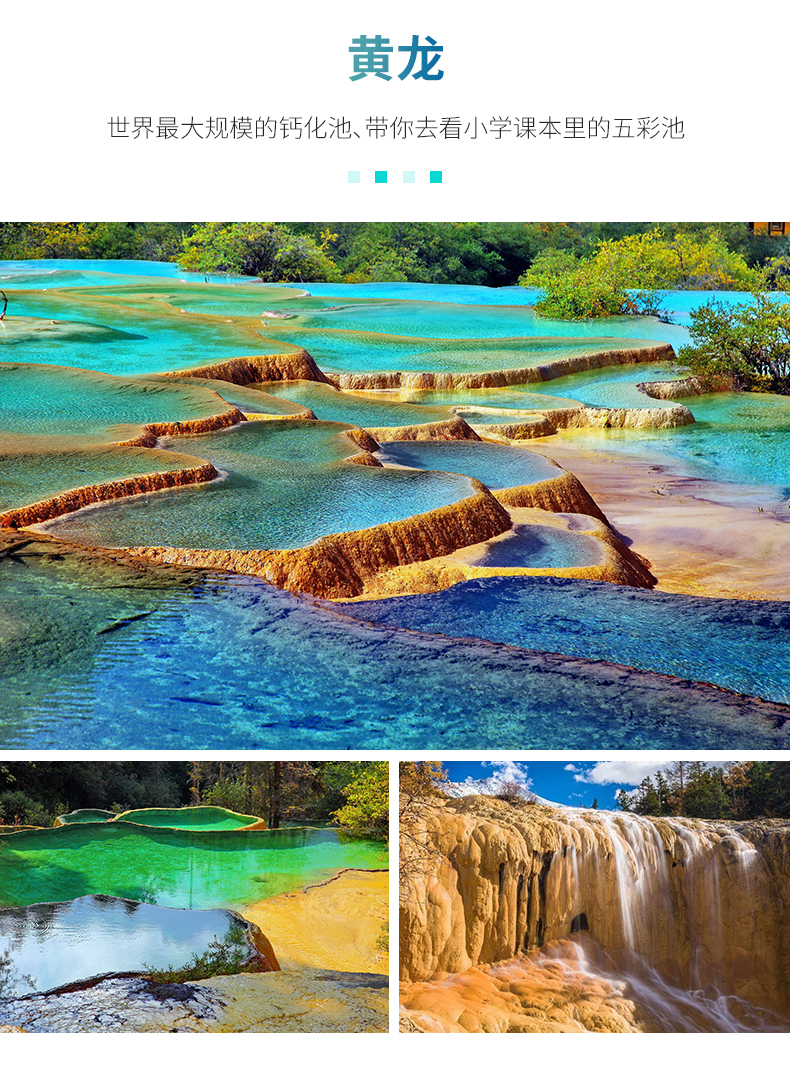 【黄龙风景区】因其独特的景观、原始的生态和丰富的资源被美称为“人间瑶池”,在这里我们可以亲身体验到“彩池、滩流、雪山、峡谷、古寺、民俗”六绝的独特魅力。黄龙风景区钙化景观非常壮观,钙化边石坝彩池、钙化滩、钙化扇、钙化湖、钙化塌陷湖、坑,以及钙化瀑布、钙化洞穴、钙化泉、钙化台、钙化盆景等一应俱全,是一座名副其实的天然钙华博物馆。乘坐索道后,我们继续沿观光道往景区最高点——五彩池、黄龙寺方向徒步,再顺着游客道便能走出景区;体力有限的游客也可以选择不行返回索道口,自费乘坐索道离开景区。