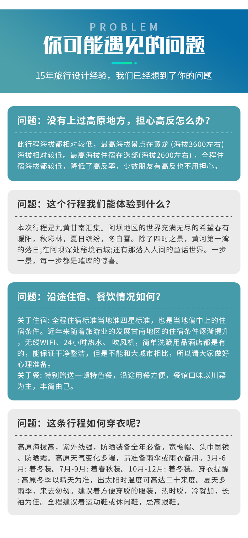 2、有心脏病、高血压、哮喘、心脑血管疾病、血液系统疾病、精神疾病等,心、肺、脑、肝、肾有明显的病变以及严重贫血或高血压的客人等患者请勿前往;如您不清楚自己是否能参与高原藏区的旅行活动,建议您提前向有经验的医生请教,并尽量本着稳健的原则选择性参与,对自己的人身安全负责;