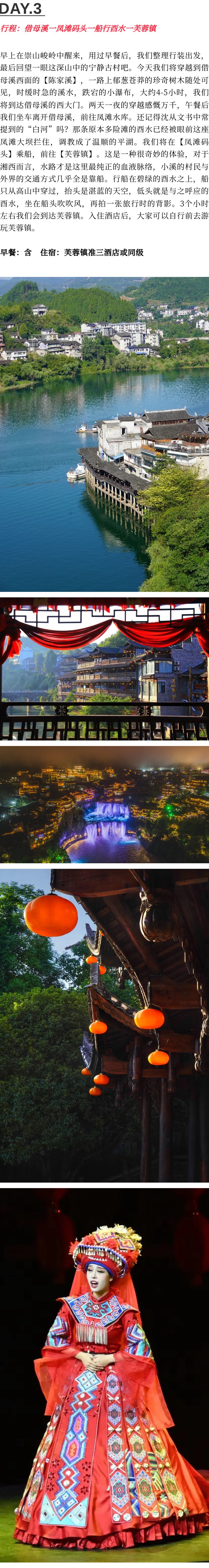 早上在崇山峻岭中醒来,用过早餐后,我们整理行装出发,最后回望一眼这深山中的宁静古村吧。今天我们将穿越到借母溪西面的【陈家溪】,一路上郁葱苍莽的珍奇树木随处可见,时缓时急的溪水,跌宕的小瀑布,大约4-5小时,我们将到达借母溪的西大门。两天一夜的穿越感慨万千,午餐后我们坐车离开借母溪,前往凤滩水库。还记得沈从文书中常提到的“白河”吗?那条原本多险滩的酉水已经被眼前这座凤滩大坝拦住,调教成了温顺的平湖。我们将在【凤滩码头】乘船,前往【芙蓉镇】。这是一种很奇妙的体验,对于湘西而言,水路才是这里最纯正的血液脉络,小溪的村民与外界的交通方式几乎全是靠船。行船在碧绿的酉水之上,船只从高山中穿过,抬头是湛蓝的天空,低头就是与之呼应的酉水,坐在船头吹吹风,再拍一张旅行时的背影。3个小时左右我们会到达芙蓉镇。入住酒店后,大家可以自行前去游玩芙蓉镇。