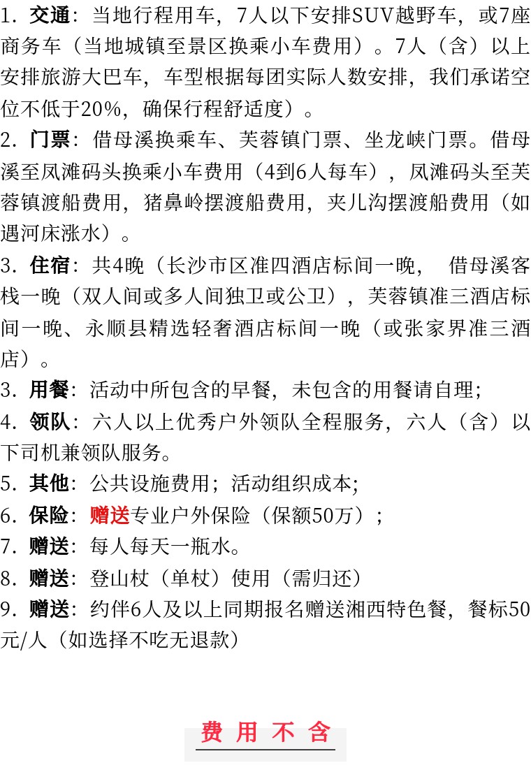 9. 赠送:约伴6人及以上同期报名赠送湘西特色餐,餐标50元/人(如选择不吃无退款)