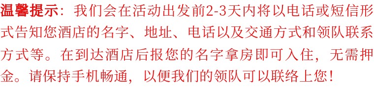 温馨提示:我们会在活动出发前2-3天内将以电话或短信形式告知您酒店的名字、地址、电话以及交通方式和领队联系方式等。在到达酒店后报您的名字拿房即可入住,无需押金。请保持手机畅通,以便我们的领队可以联络上您!