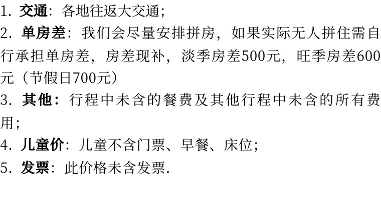 2. 单房差:我们会尽量安排拼房,如果实际无人拼住需自行承担单房差,房差现补,淡季房差500元,旺季房差600元(节假日700元)