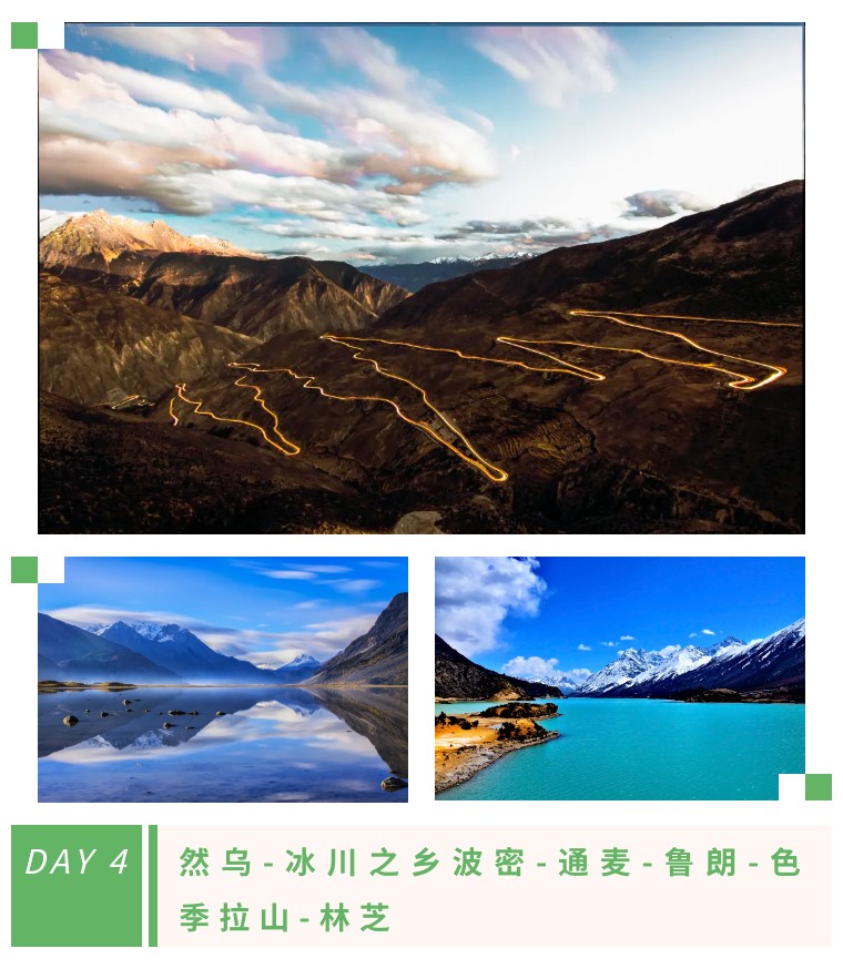 早餐后告别然乌,随后前往【冰川之乡波密】,那里所具有的,是真正属于西藏的、雪山高地韵味的景象。沿帕龙藏布江在原始森林中穿行,向滇川藏线上最后的天险通麦出发。通麦至排龙15公里路段,遍布雪山河流,山体疏松,脆弱,一遇风雨或冰雪融化,极易发生泥石流和塌方,特别是通麦一带有死亡路段之称(现已开通通麦大桥,通麦天险变通途)之后翻越冰雪覆盖,云雾缭绕,海拔4702米的色季拉山,此山以春夏时的杜鹃花海闻名,同时此山也是观看南迦巴瓦峰最好的地方之一。站在色季拉山,遥望著名的南迦巴瓦峰,接受神山的洗礼。翻过色季拉山即一路下坡抵达尼洋河下游河谷的林芝县城,继续行车19公里抵林芝地区首府八一镇,座落在尼洋河畔的八一镇海拔2400米,被称为“西藏的江南”。随后入住林芝酒店。
