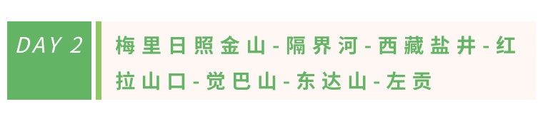 早上起来观赏梅里雪山“日照金山”,当第一缕朝阳把“梅里雪山”主峰“卡瓦格博”染成了金色,那耀眼的金色让每个人心潮澎湃,内心震憾。从这里你将领略藏区八大神山之首,世界最美的雪山之一,神圣的梅里十三峰全景。欣赏完日照金山早餐后出发前往西藏盐井抵达隔界河,在这里休息拍照留念后抵达【西藏盐井】。中餐在盐井吃最地道美味的【盐井加加面】。午餐后行驶十几分钟抵达古盐田观景台拍照留念,随后继续沿澜沧江大峡谷约一小时抵达【红拉山垭口】观看嘎托雪山全景。欣赏嘎托雪山后到达【如美】小镇,这里紧邻澜沧江边,是G318川藏南线、G214滇藏线汇合后进藏唯一的交通要道和重要节点,海拔仅2600多米,含氧丰富、景色俱佳。途中翻越高山峡谷,迎接视觉盛宴。在山路蜿蜒中翻越【觉巴山】,一边是澜沧江波涛汹涌,一边是壁立千仞,一山藏四季,顷刻有风雨。翻过觉巴山继续往前,翻越东达山,抵达海拔5008米的【东达山垭口】。夏季草坪青绿,牦牛成群,风光极为美丽,最后抵达左贡,入住酒店。