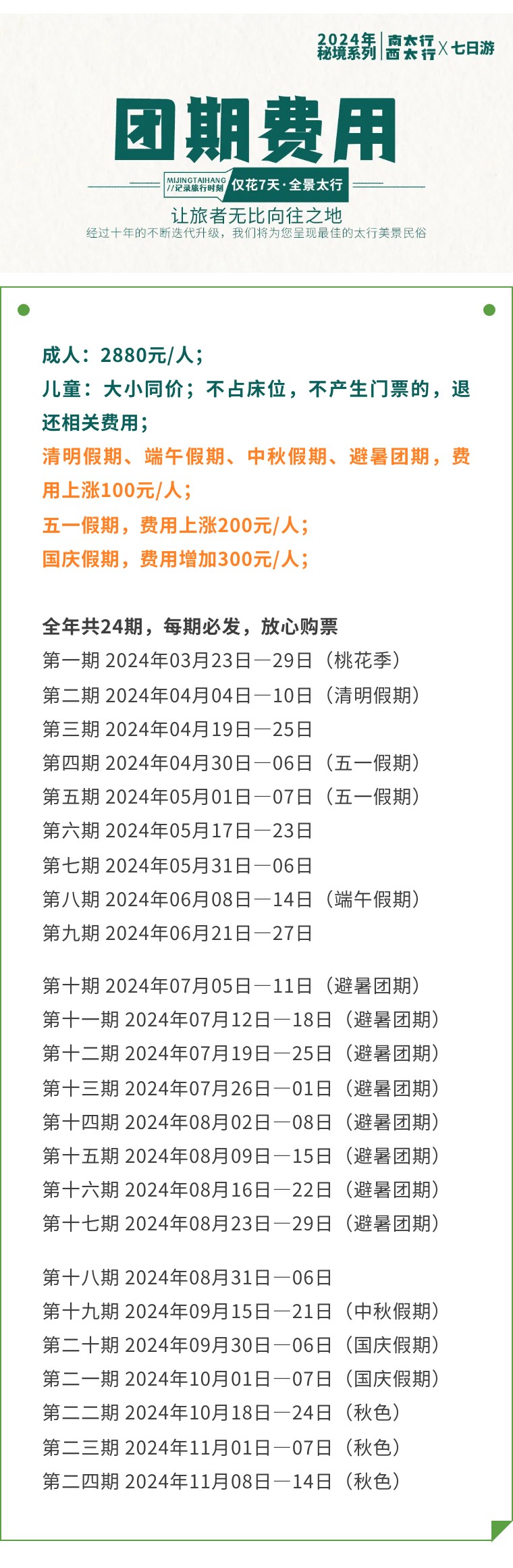 清明假期、端午假期、中秋假期、避暑团期,费用上涨100元/人;