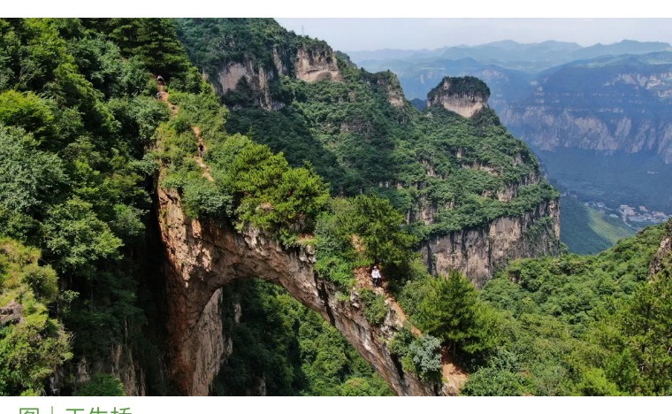 沿着羊肠小道一路行走,便抵达【天生桥】。这是迄今我国北方发现的最大的天然石拱桥。天然石桥飞跨于南北危崖之间,远远望去颇似一座巨大的山门,真乃鬼斧神工、天造地设的世间奇观。站在桥上,天上白云飘动,望之仿佛天旋地转、山倒桥移一般,即便是万里无云的天气,两侧那深不见底的深渊仍然给人以强烈的震憾。