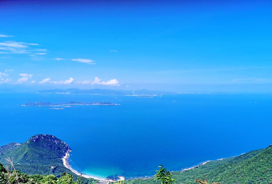 山顶两侧是大海、远处飘浮的小岛、天空的白云