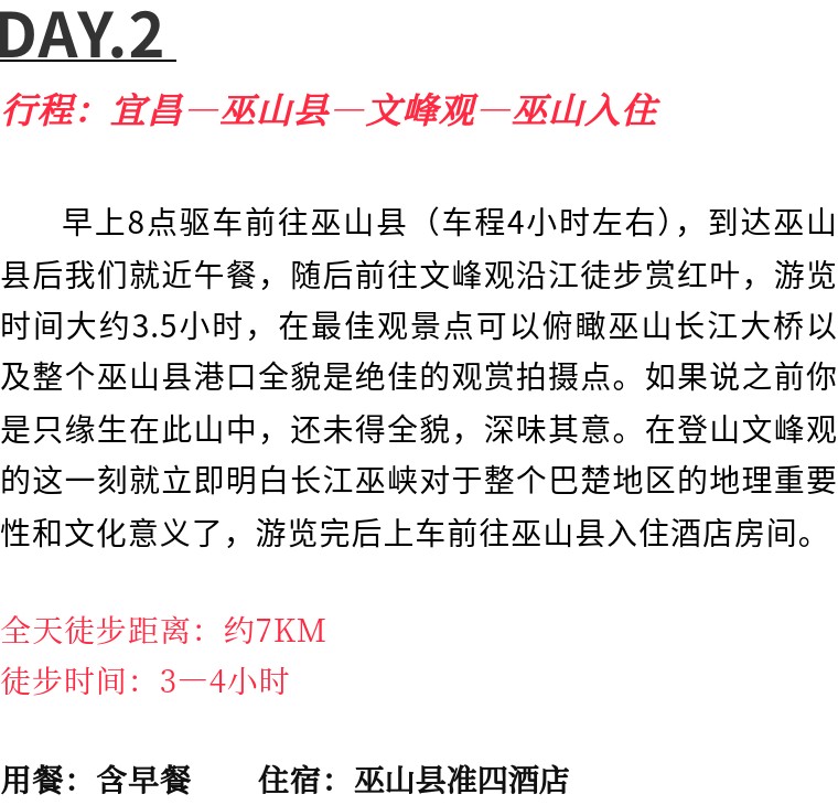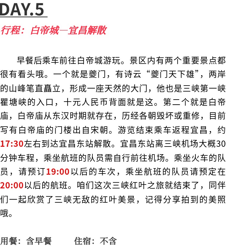 A:这次活动提供接机接站服务,领队会至少提前3天发送交通指引给您,最后一天会送站/机场服务,约15:00依次抵达火车站/三峡机场,建议预定17:00以后的火车票,18:00以后的机票。