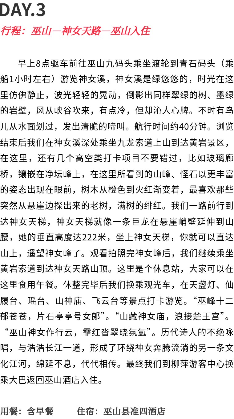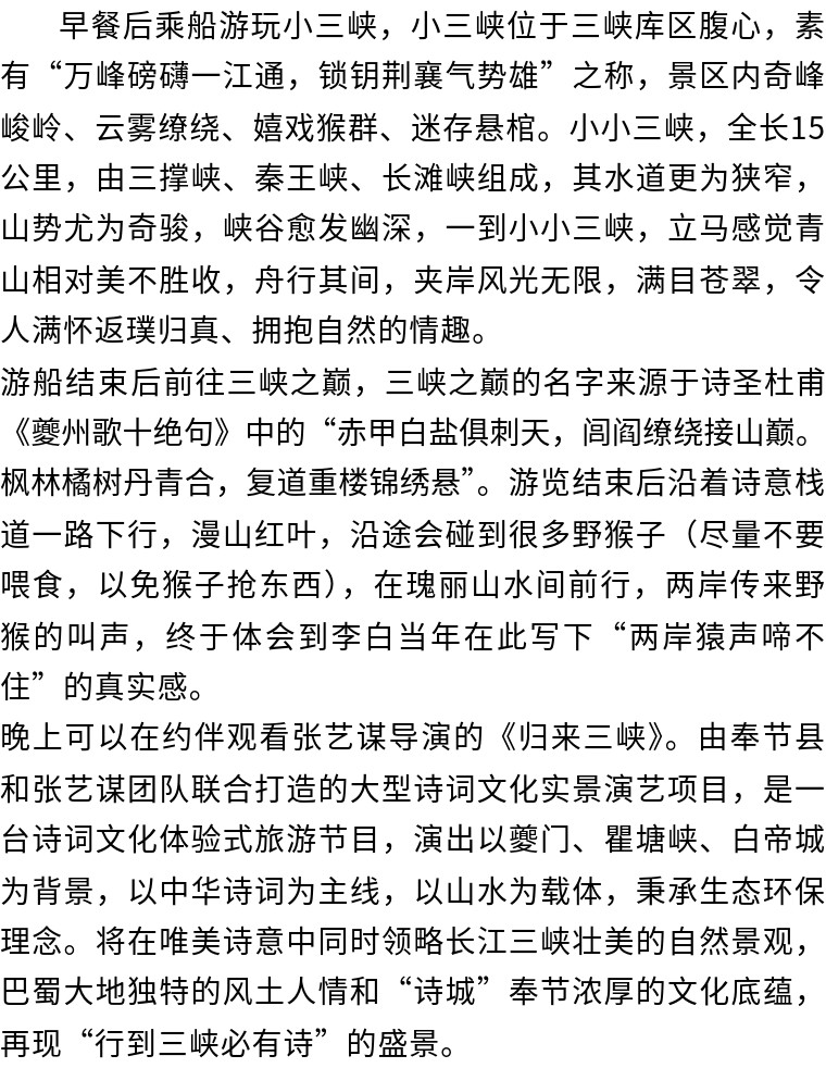 A:只要不是大暴雨,行程都是可以正常走的,请自备雨衣。秋雨蒙蒙的时候,巫峡上空的云雾翻腾,十分壮观,我们徒步三峡画廊从上往下俯瞰巫峡,就完全能理解诗人元稹写下“除却巫山不是云”这句诗的时候的心情了!