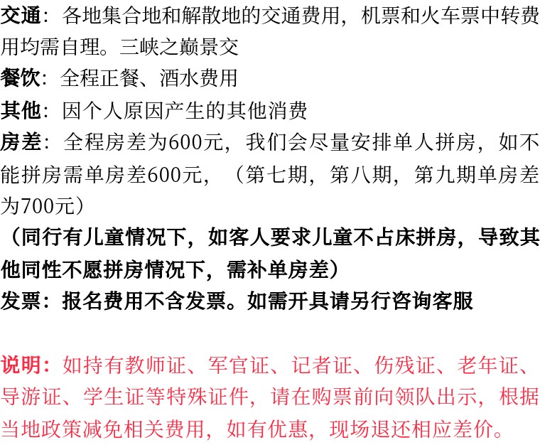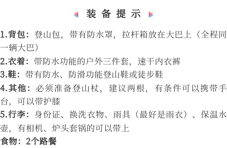 4. 参加者须身体健康,无心脑血管病史;自带常用药品:止血贴,人丹,藿香正气丸,腹可安等!