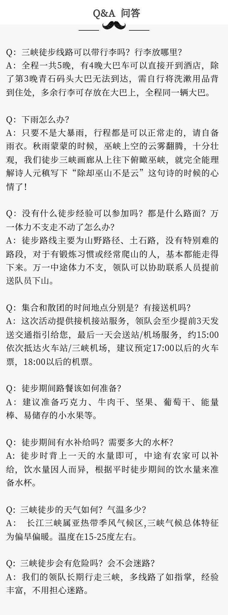 A:我们的领队长期行走三峡,多线路了如指掌,经验丰富,不用担心迷路。