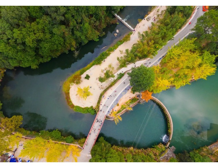 从林家铺子码头旁,过河到对岸进入步道,途径红枫湖、鹿栖谷、黄金大道;