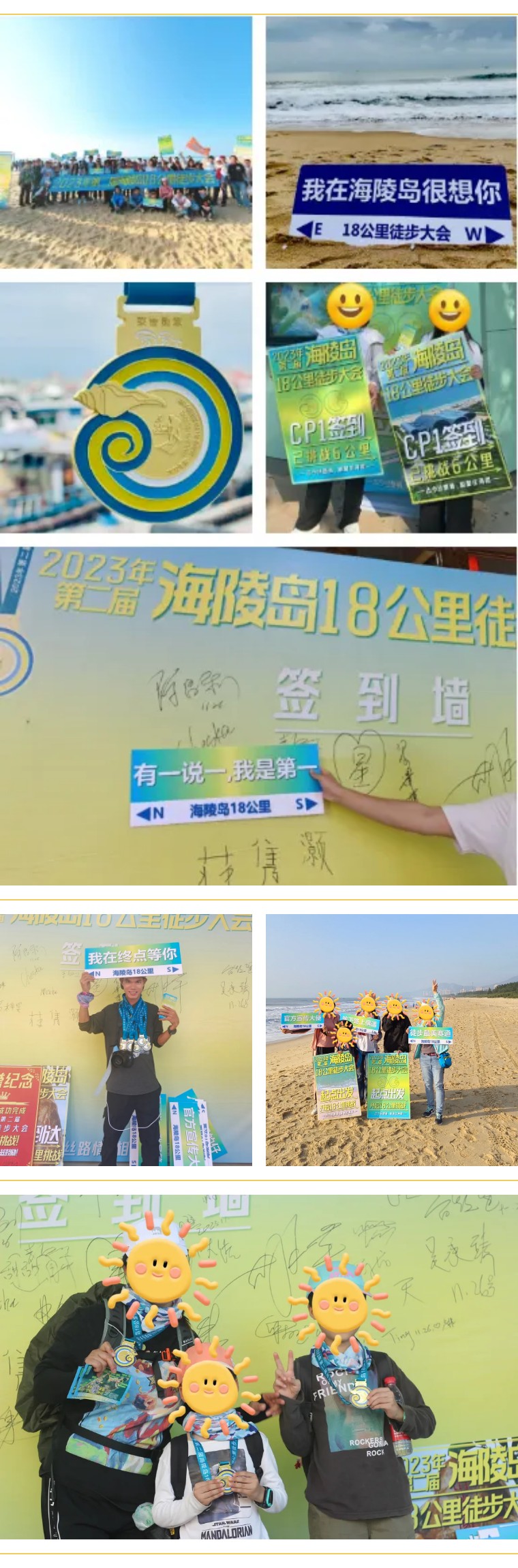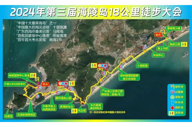 全程约18公里,由原生态树荫道、细软沙滩、人行道路、水泥路等组成,设有两个签到饮用水补给点,预计用时4-6小时左右;