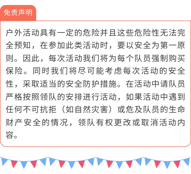 户外活动具有一定的危险并且这些危险性无法完全预知,在参加此类活动时,要以安全为第一原则。因此,每次活动我们将为每个队员强制购买保险。同时我们将尽可能考虑每次活动的安全性,采取适当的安全防护措施。在活动中请队员严格按照领队的安排进行活动,如果活动中遇到任何不可抗拒(如自然灾害)或危及队员的生命财产安全的情况,领队有权更改或取消活动内容。