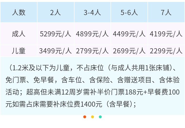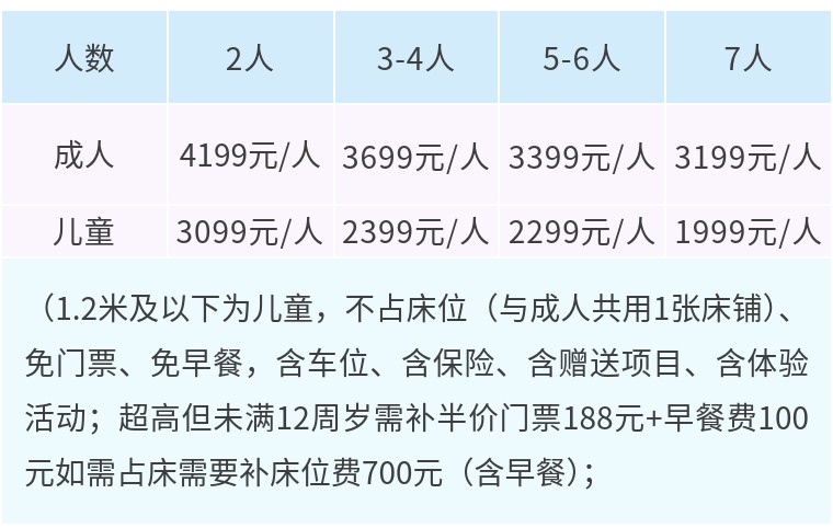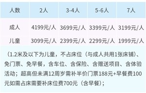 儿童 | 3399元/人 | 2699元/人 | 2599元/人 | 2199元/人 |