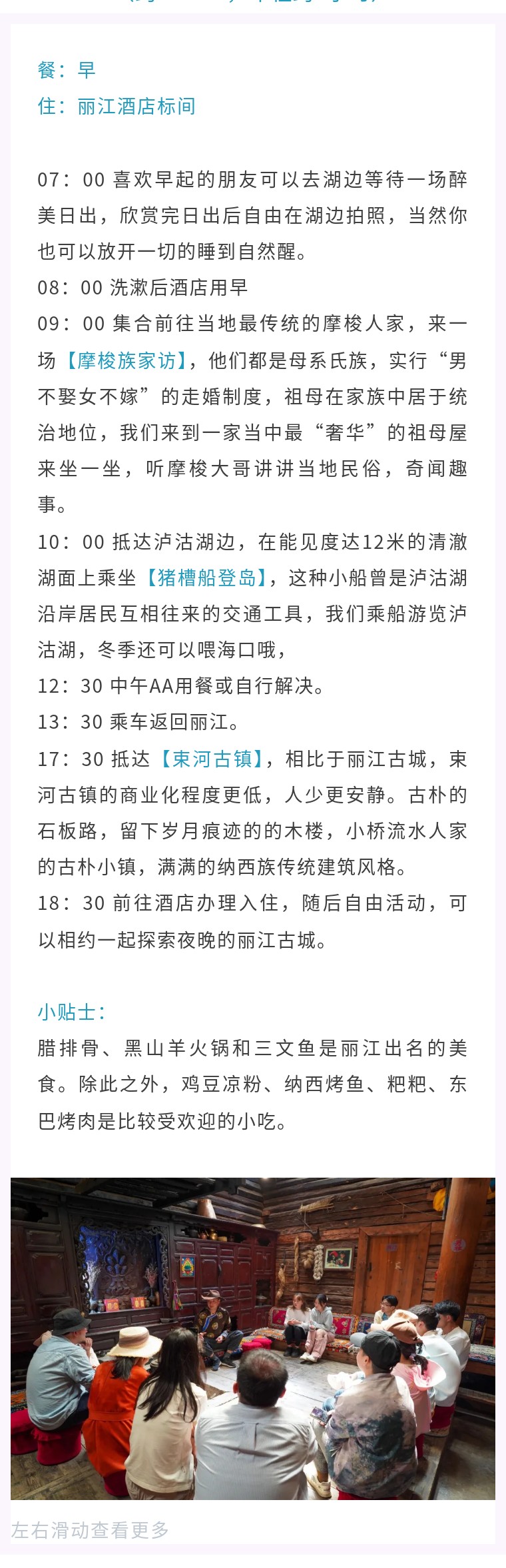 摩梭族家访-猪槽船游湖-里务比岛-丽江-束河古镇(约230KM,车程约4小时)