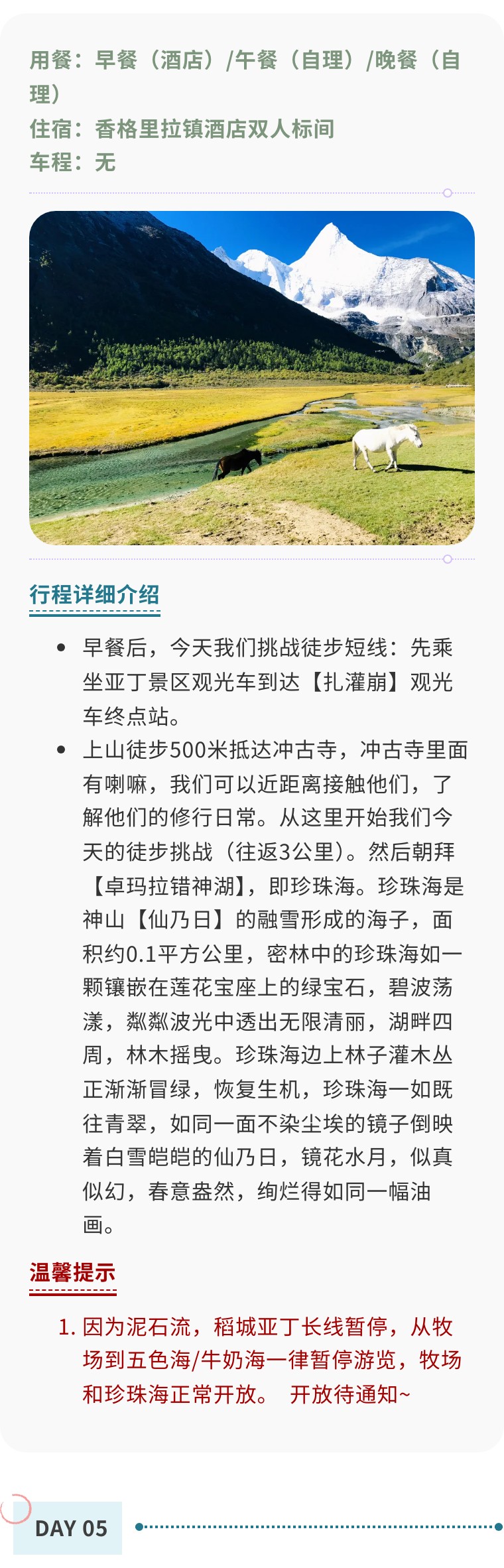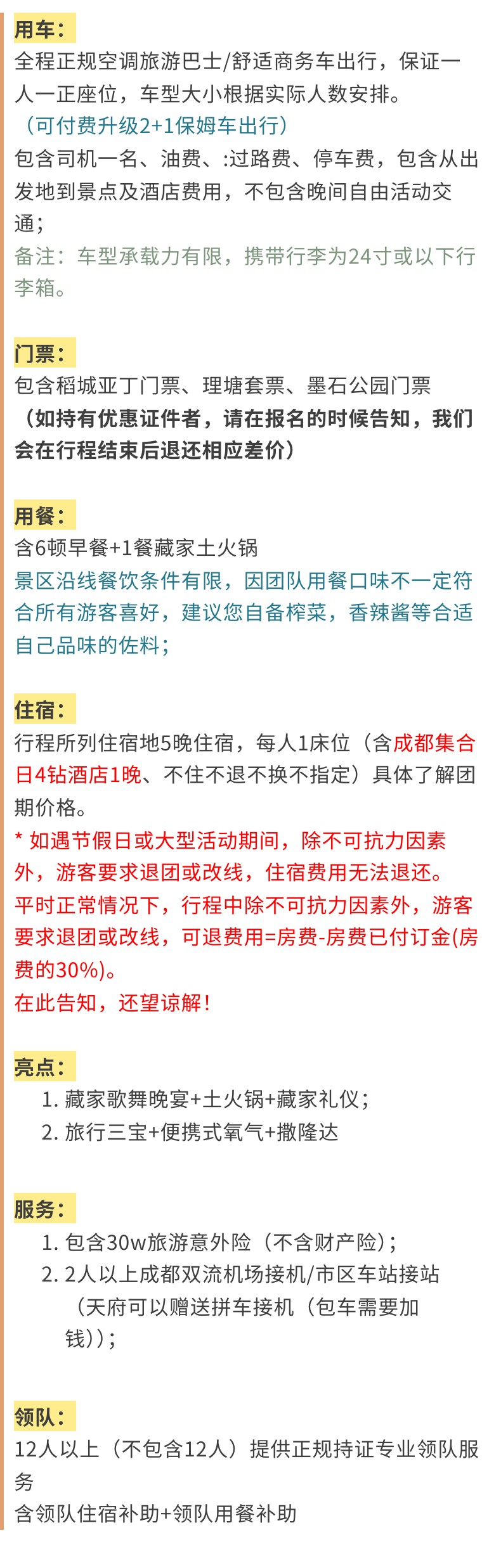 在不减少主要景点的前提下,组织方有权利根据天气、航班、交通、季节、旺季人潮等因素,调整游览景点的先后顺序。藏区春夏季多雨,经常造成泥石流及塌方,由于以上原因及其他人力不抗拒原因而造成团队不能按照行程前往目的地以外地区旅游,接待方不承担任何赔偿责任,我们将会根据实际情况另外增加景点用以弥补,费用多退少补。