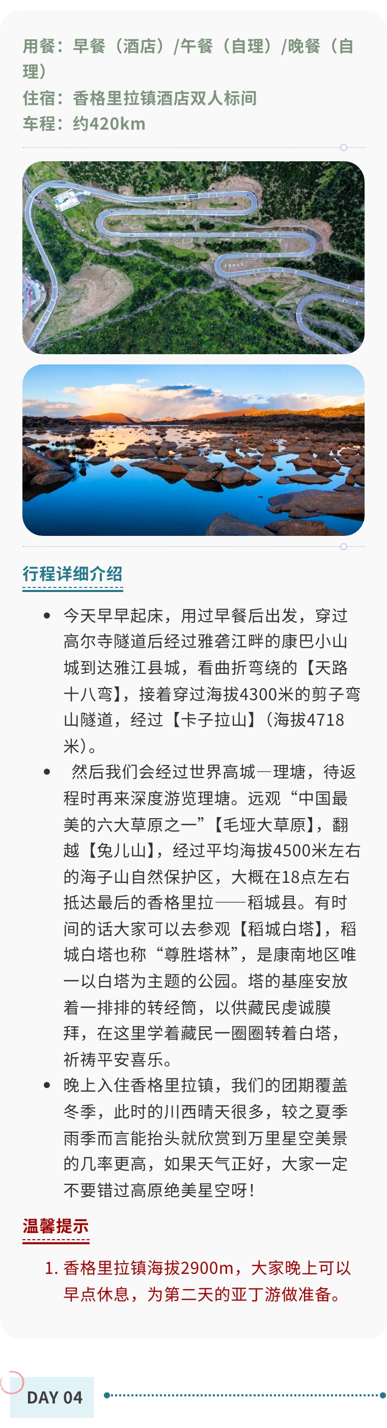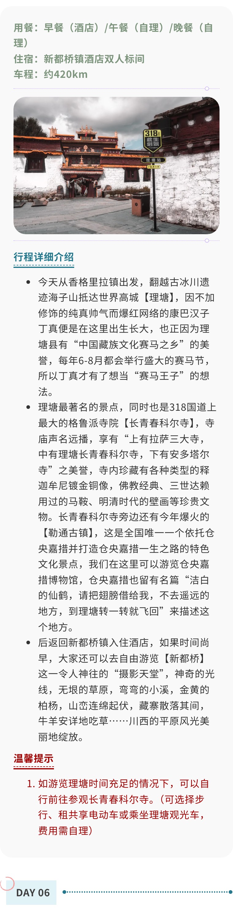 (1)到当地游玩希望您尊重原著文化、当地风俗以及他们的宗教信仰。接触另类生活人群和他们的文化时,尊重当地的文化和传统,与人平等相处才能发现一个完全不同的世界,减少旅游给当地文化和传统带来的影响,在藏地摄影时,请尊重当地的管理规定和民风民俗,对于关卡,桥梁,军事管理区,私人住宅,寺庙,法事,以及其它各种有拍摄禁忌的地方,请不要拍照,如果强行拍照,可能会造成相机被没收或者更严重的后果,由此造成的不良后果和影响,队员自负。