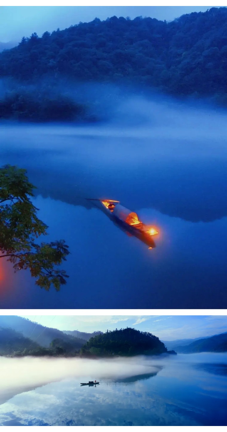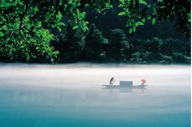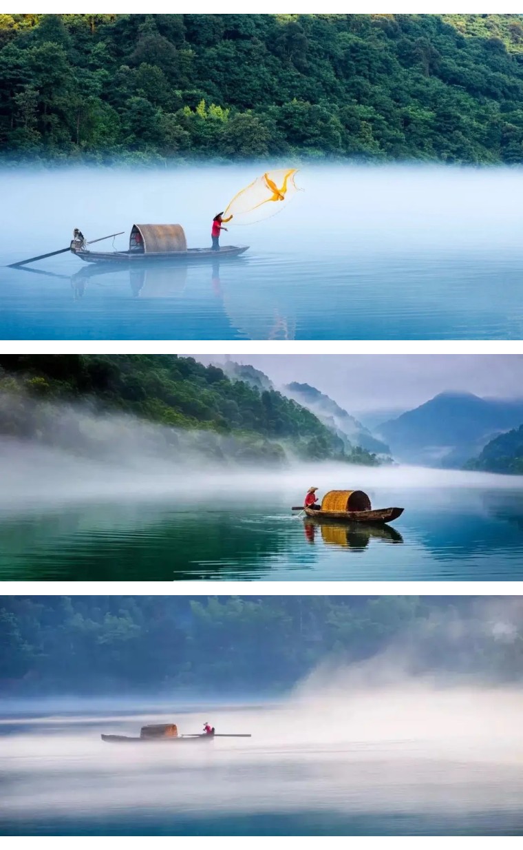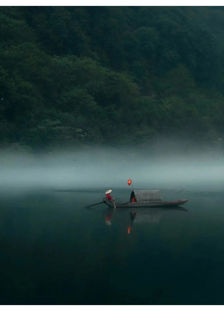 渔翁乘一叶扁舟,自雾中悠悠驶来
