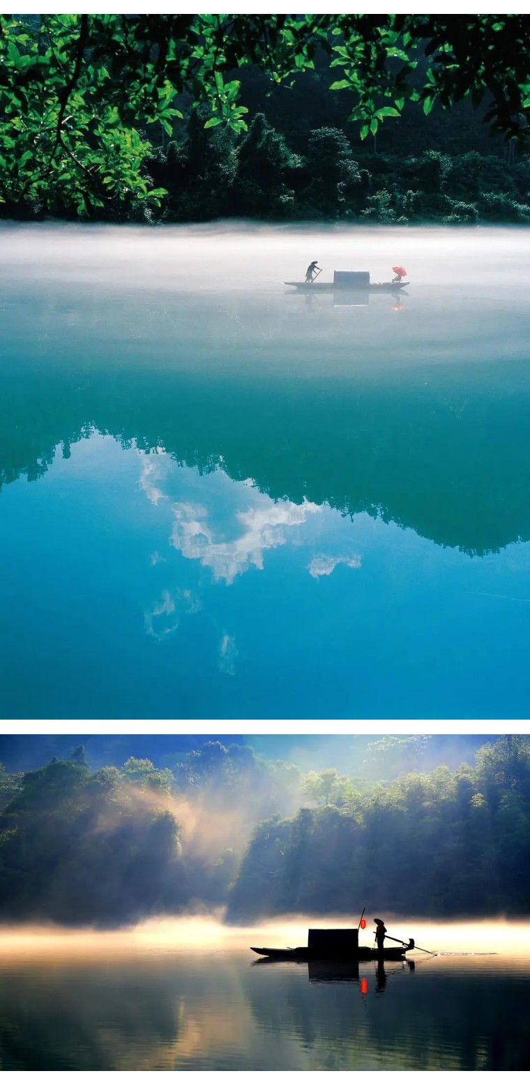 远山如黛,青山碧流,烟波浩渺,碧波如镜