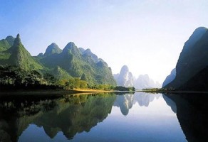 乘舟泛游漓江中,可观奇峰倒影、碧水青山、古朴的田园人家。