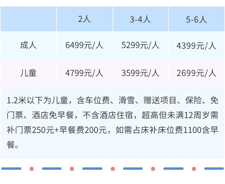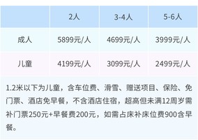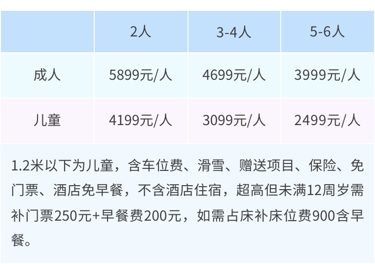 1.2米以下为儿童,含车位费、滑雪、赠送项目、保险、免门票、免早餐,不含酒店住宿,超高但未满12周岁需补门票250元+早餐费200元,如需占床补床位费900(特价、正价团期)-1100(春节团期)含早餐。