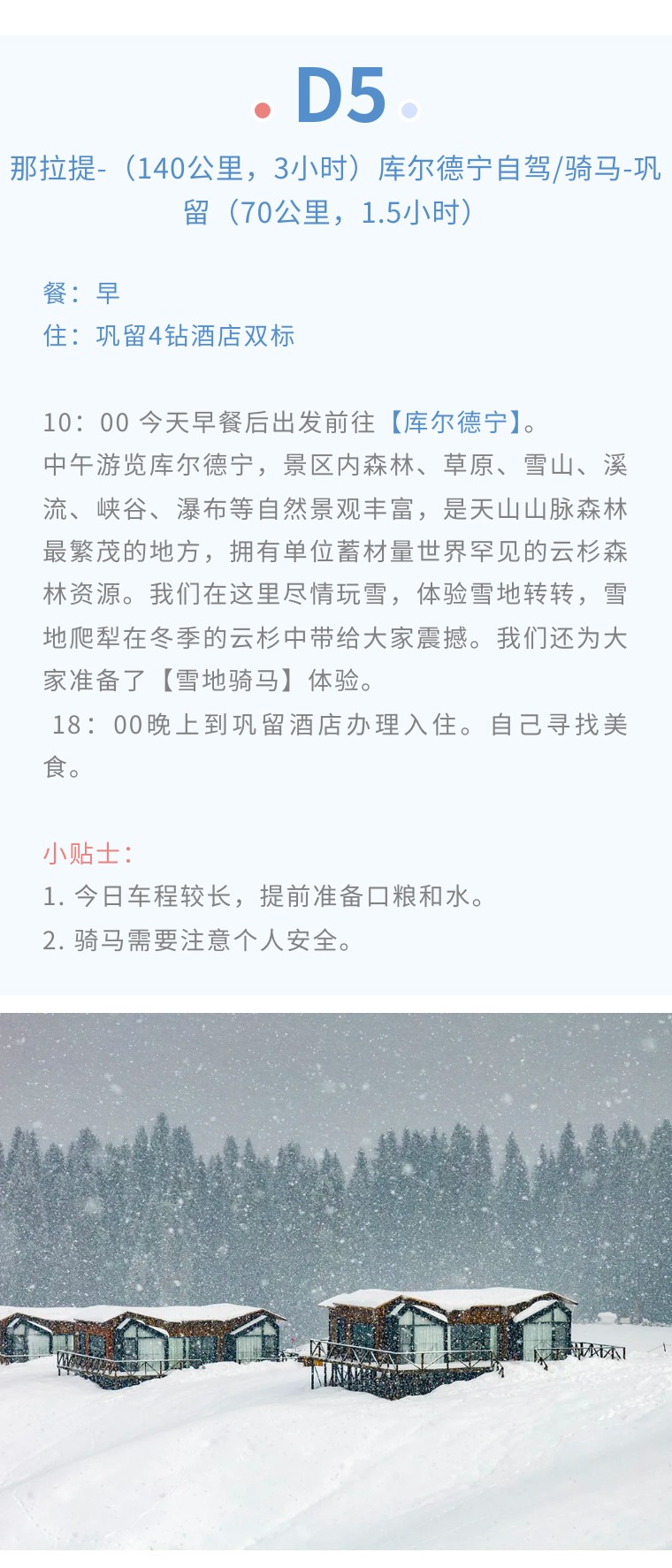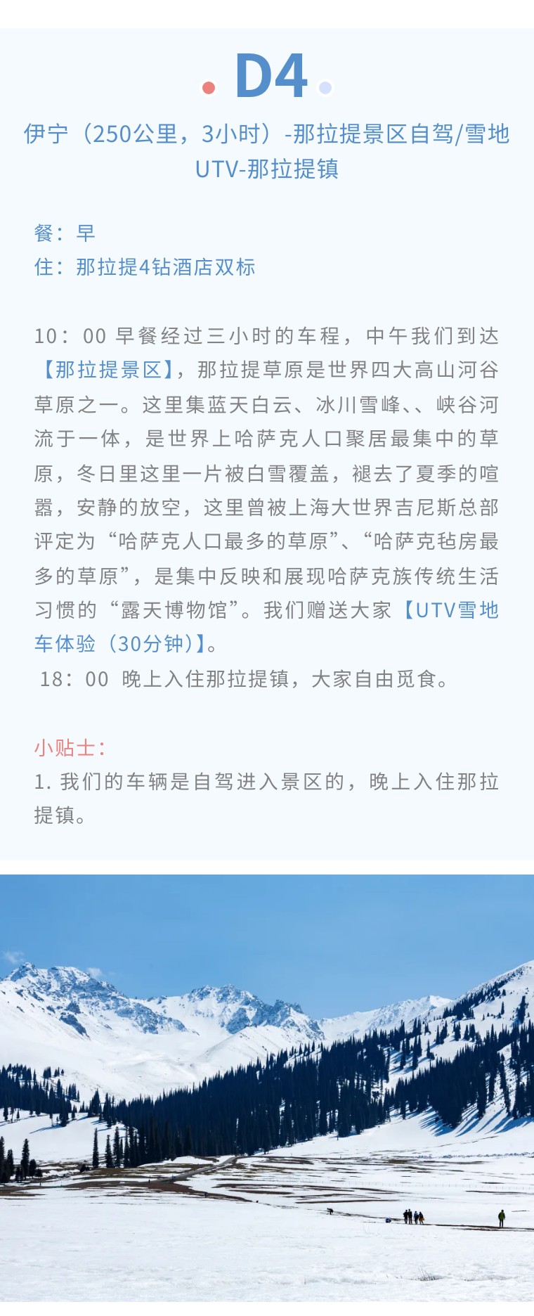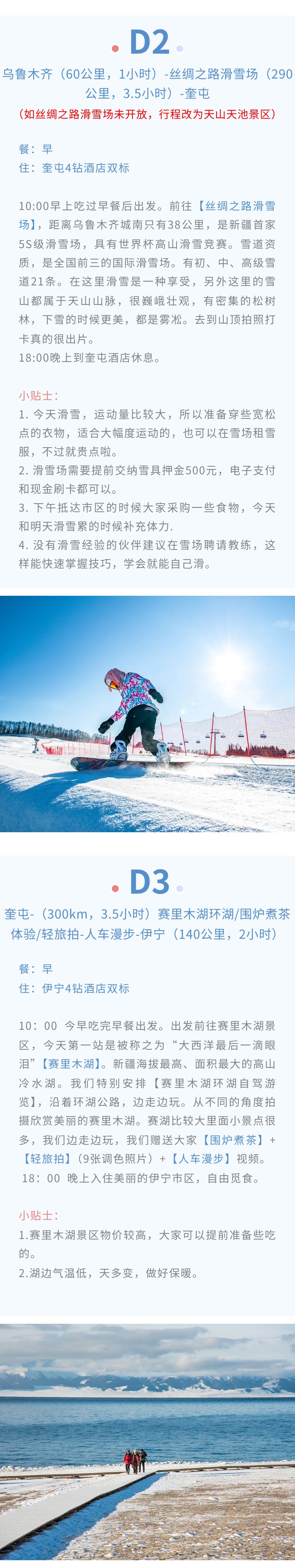 4、门票:丝绸之路国际滑雪场初级雪票+雪板,赛里木湖自驾环湖,那拉提自驾,库尔德宁自驾门票,天鹅泉门票;