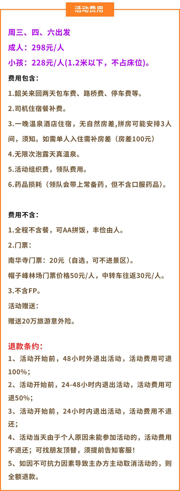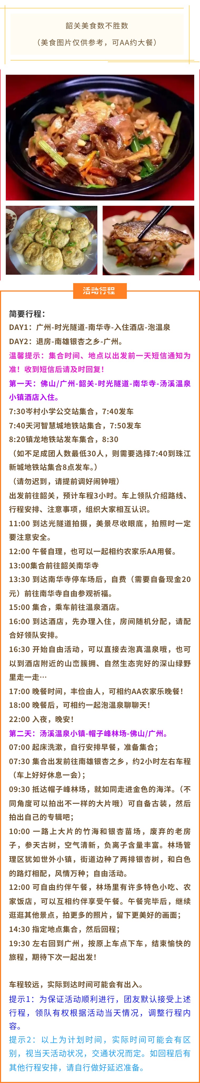 优惠2:分享再减10元:转发本海报到4个以上邻居群,周边聊天群,配文:周末跟团去韶关有没有一起,家门口上车好方便,价格也很实惠,团长要组够30人以上才出发。 (发到群后保留3分钟再截图给客服,即可报名后出发前一天返10元/人哦)