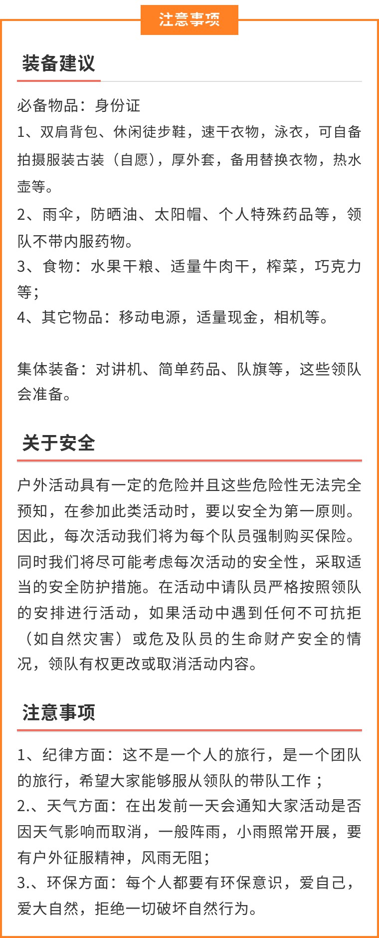 2.、天气方面:在出发前一天会通知大家活动是否因天气影响而取消,一般阵雨,小雨照常开展,要有户外征服精神,风雨无阻;