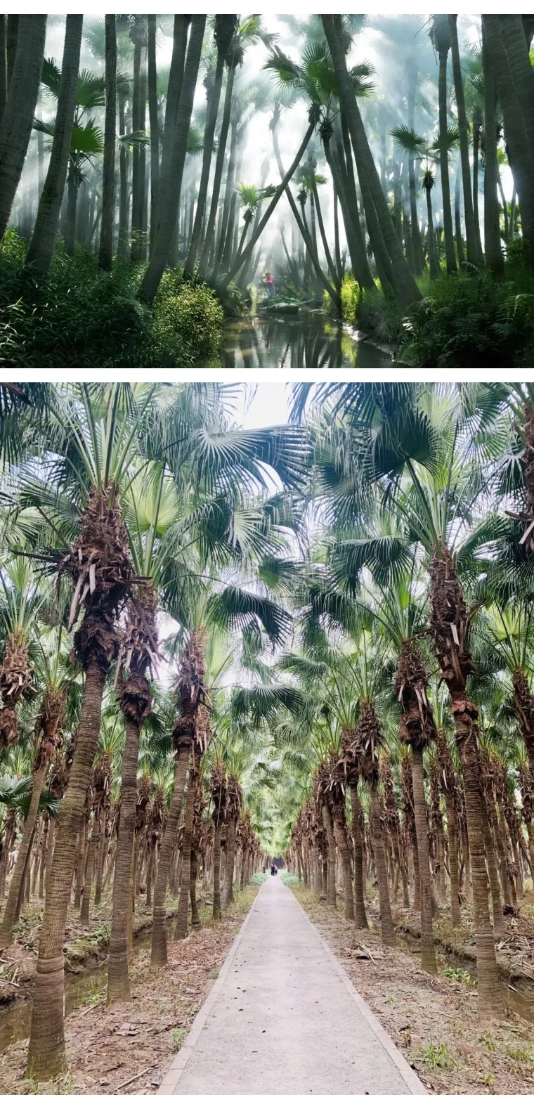 11:30-13:30 拍摄中国最大的【新会千亩蒲葵林】,还有成片的落羽杉,阳光照射错落密布葵树形成了光与影的世界,蒲葵园中不定期会有人工烟雾,就像误入了仙境一般(葵园有农庄,可自由约伴午餐)