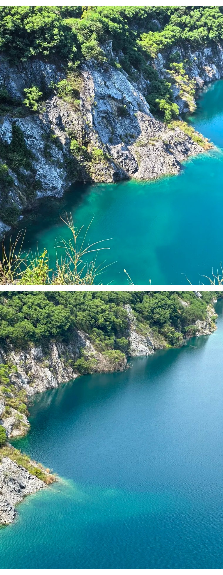 10:00 左右到达“广东版蓝眼泪”,青山绿水环绕,湖水蓝得像宝石,旧矿山改造的咖啡馆也太有感觉了。工业风+自然景完美碰撞!阳光洒在湖面上,湖水蓝得像巨大的蓝宝石,波光粼粼(游玩约90分钟)