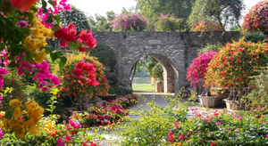 园内建筑古典雅致,亭台楼阁移步易景,与花卉景观相得益彰 。有80年以上树龄的五雀三角树嫁接五颜六色的三角梅,形成独特花海,颜色多样,姿态各异 。