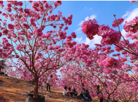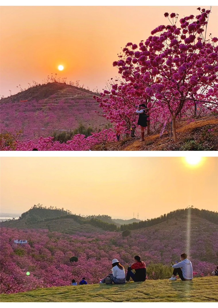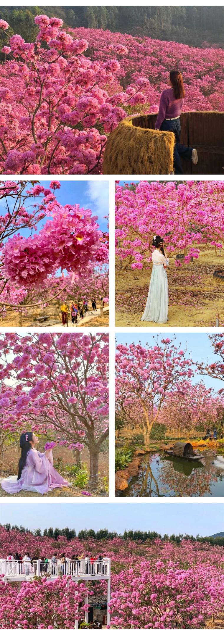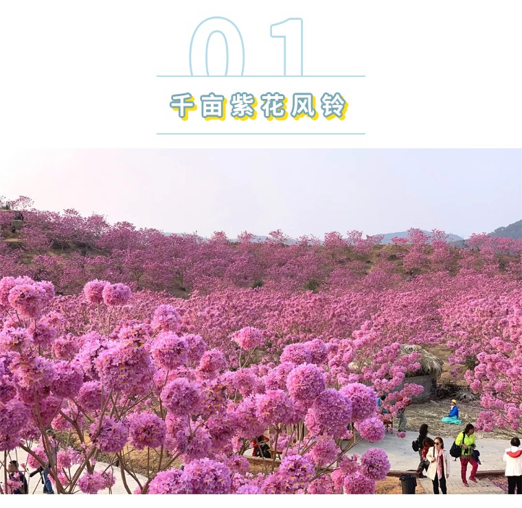 14:50 到达【绿美生态园】,占地千余亩的紫花风铃木林场,每逢冬季,这里的风铃花争相怒放,浪漫花海开满山头,形成一片姹紫嫣红的海洋