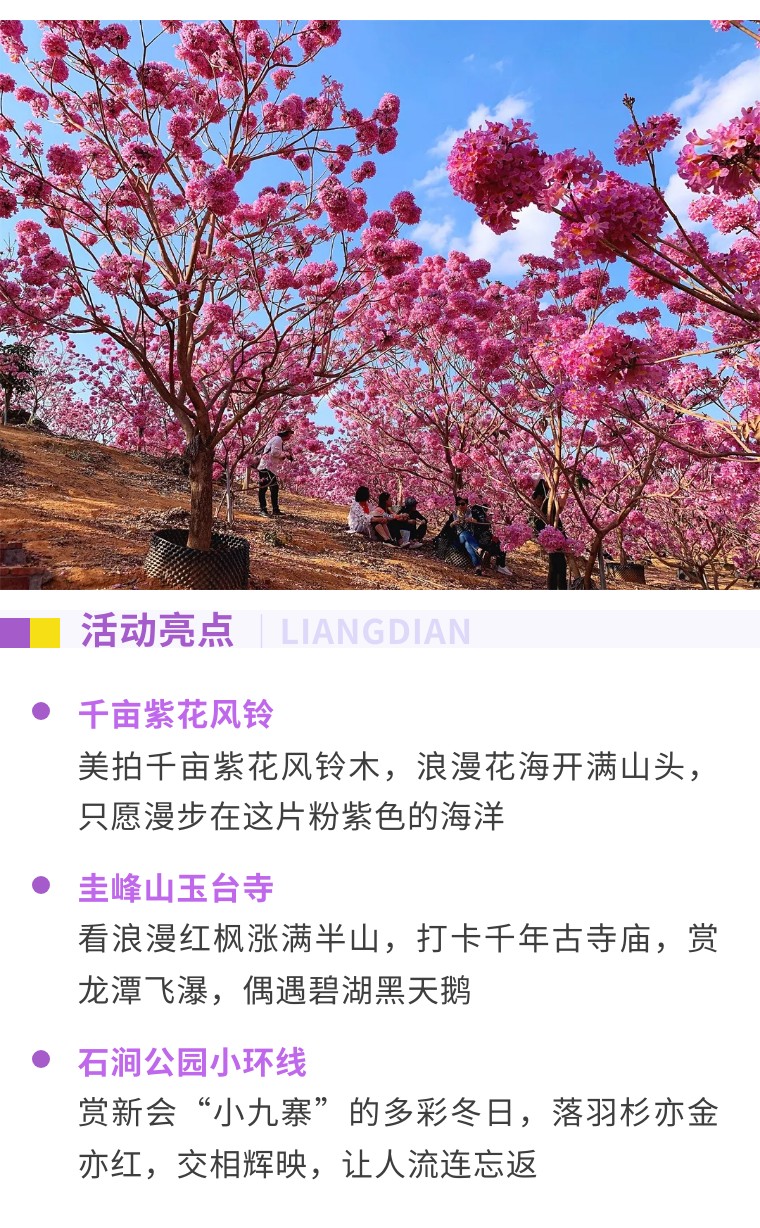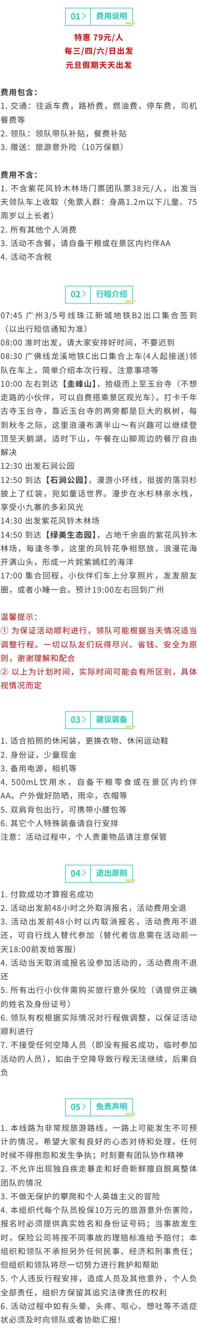 1. 不含紫花风铃木林场门票团队票38元/人,出发当天领队车上收取(免票人群:身高1.2m以下儿童、75周岁以上长者)