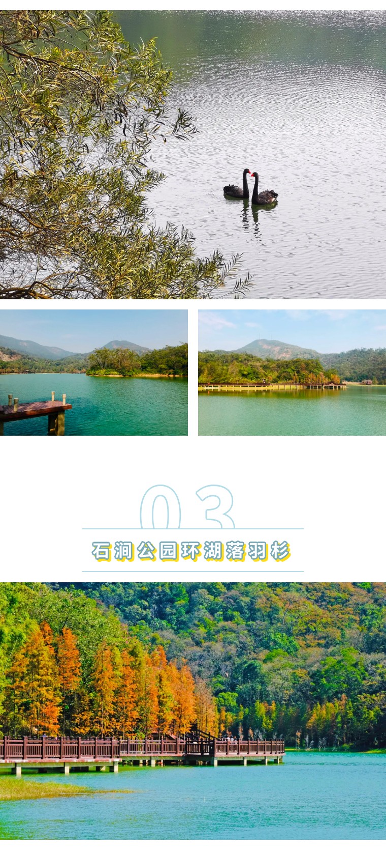 12:50 到达【石涧公园】,漫游小环线,挺拔的落羽杉披上了红装,宛如童话世界。漫步在水杉林亲水栈,享受小九寨的多彩风光