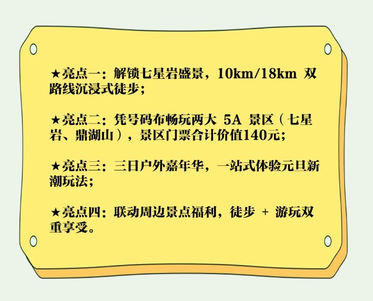 10:00-17:00 徒步大会进行时,沿着路线指引前进,开启徒步挑战!体验组关门时间5小时,挑战组关门时间7小时(路线均进入七星岩景区,打卡景区核心景点);