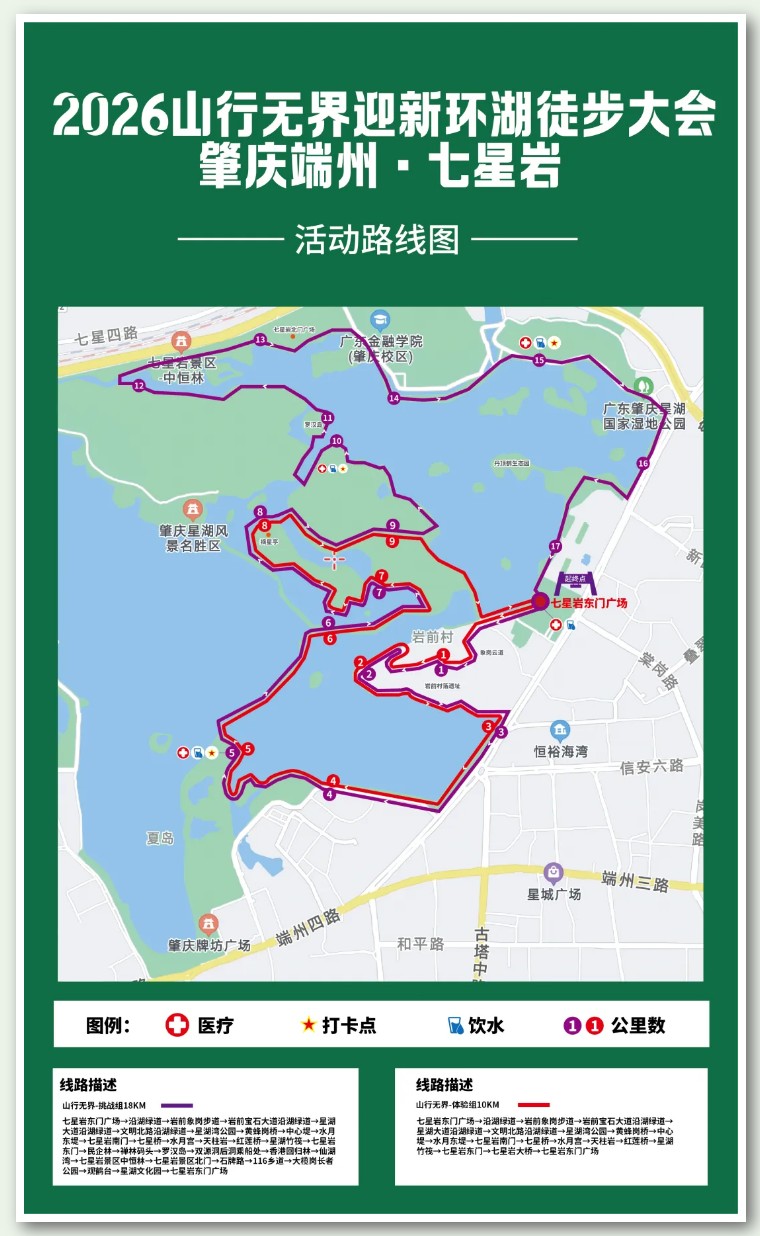 活动由端州区人民政府、肇庆星湖风景名胜区管理局主办,环湖路线特别设计进入七星岩风景区,打卡星湖核心景点,并增加新晋风景点象岗云道一览星湖全景,迎新徒步收获最精华的山湖体验。