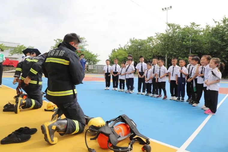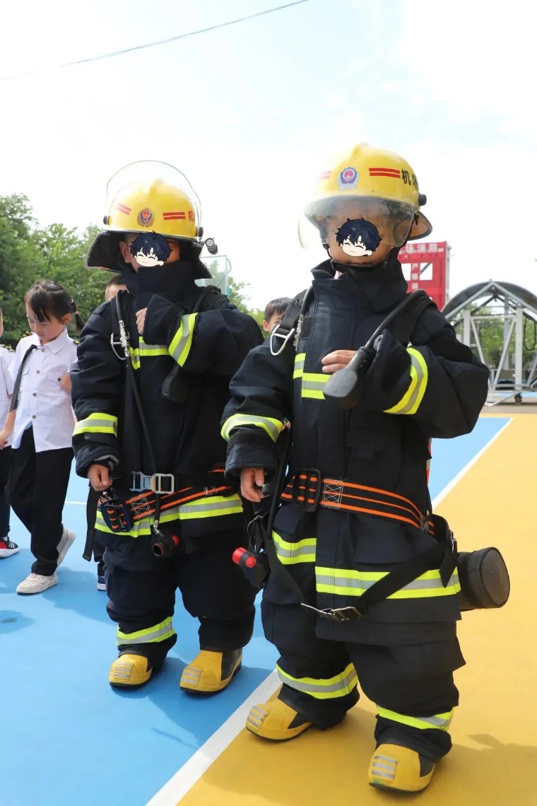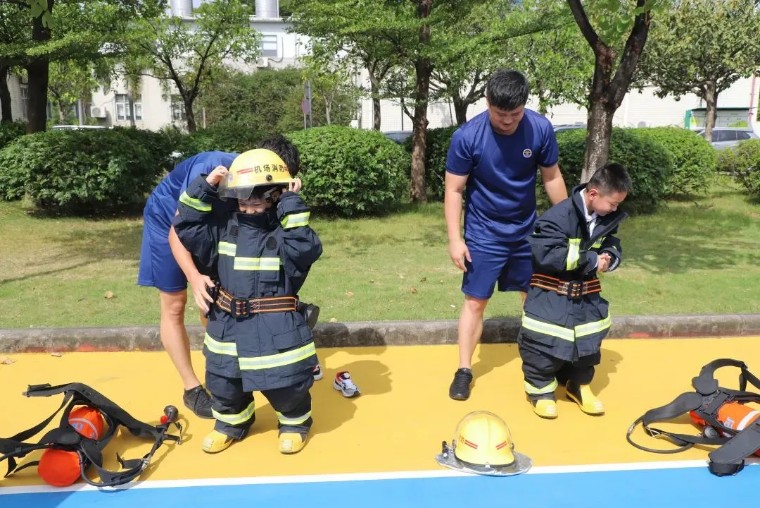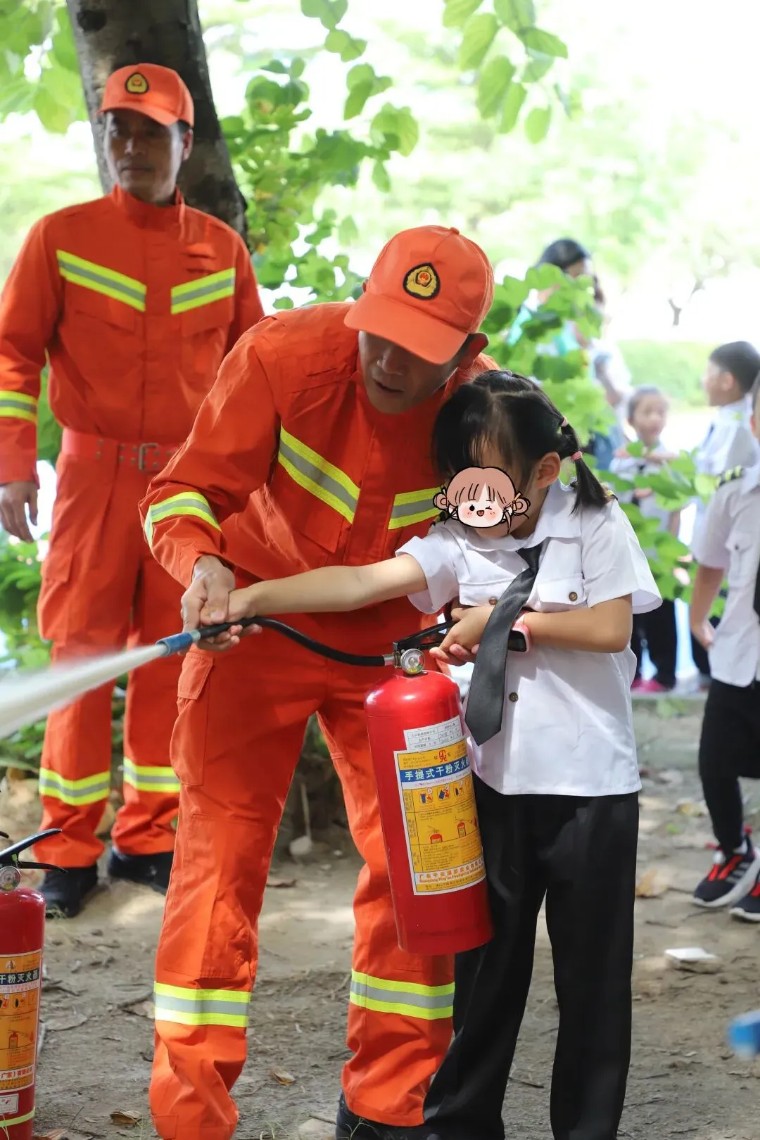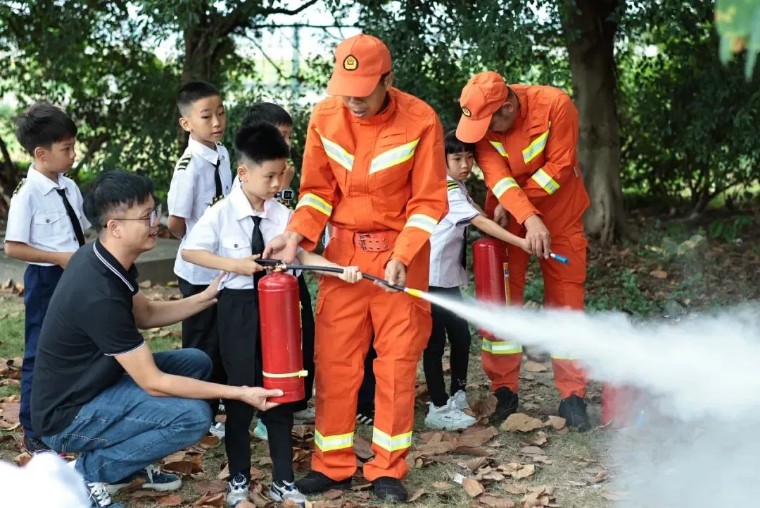 消防员带着小朋友体验灭火,如何正确使用灭火器。