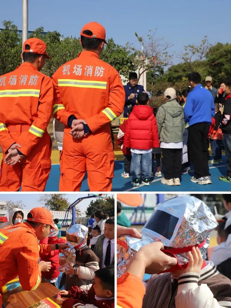 观看消防特技“灯泡 上切钢丝”表演,教会灭火器、防毒面罩等设施的正确使用方法。
