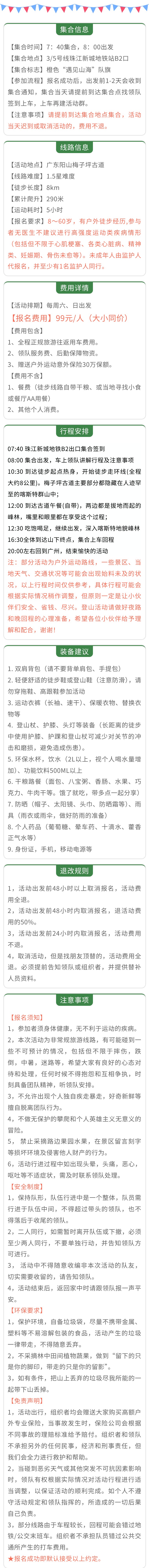 注:部分活动为户外运动路线,一些景区、当地天气、交通状况等可能会出现始料未及的状况,以上行程时间仅供参考,具体行程可能会根据实际情况稍作调整,但原则一定是让小伙伴们安全、省钱、尽兴。登山活动请做好夜路和晚回程的心理准备,希望各位小伙伴给予理解和配合,谢谢!