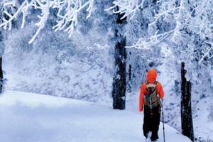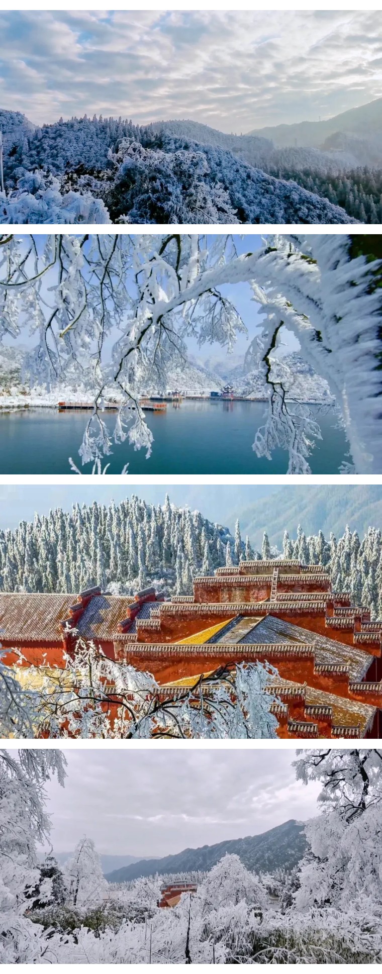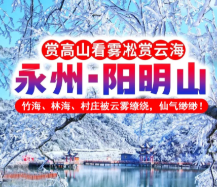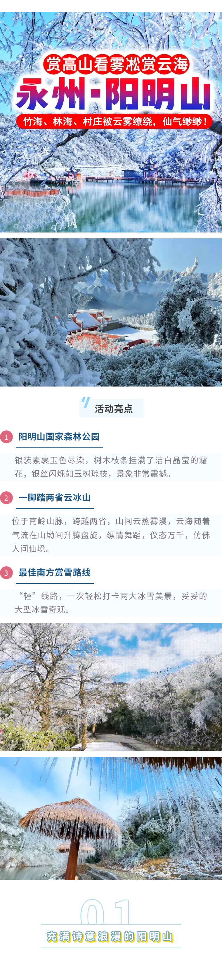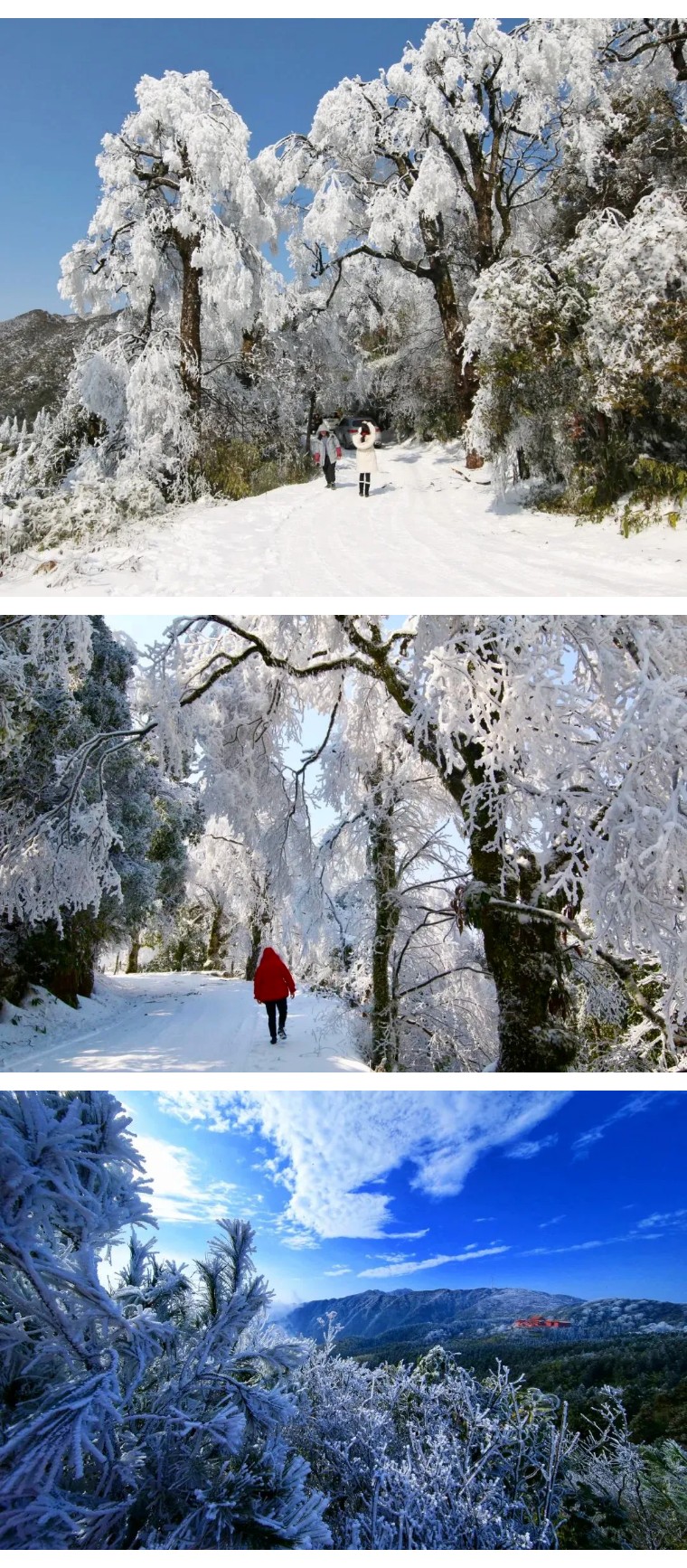 08:00 左右到达阳明山。每逢冷空气来临,山上就会展观的雾海雾凇奇观,竹海、林海、村庄被云雾缭绕,仙气缈缈,万寿寺前云海翻涌,波澜壮阔,景象非常震撼。到达阳明之巅,再爬上898级天梯,真正走上顶峰,四周白雪皑皑,好一派南国雪景。(注:从山门走到阳明山顶峰,总共12公里,往返需要7小时,建议是徒步登山,坐车下山,这样既有登山的乐趣,又节省了体力,主要还留充足的时间玩和拍照。)